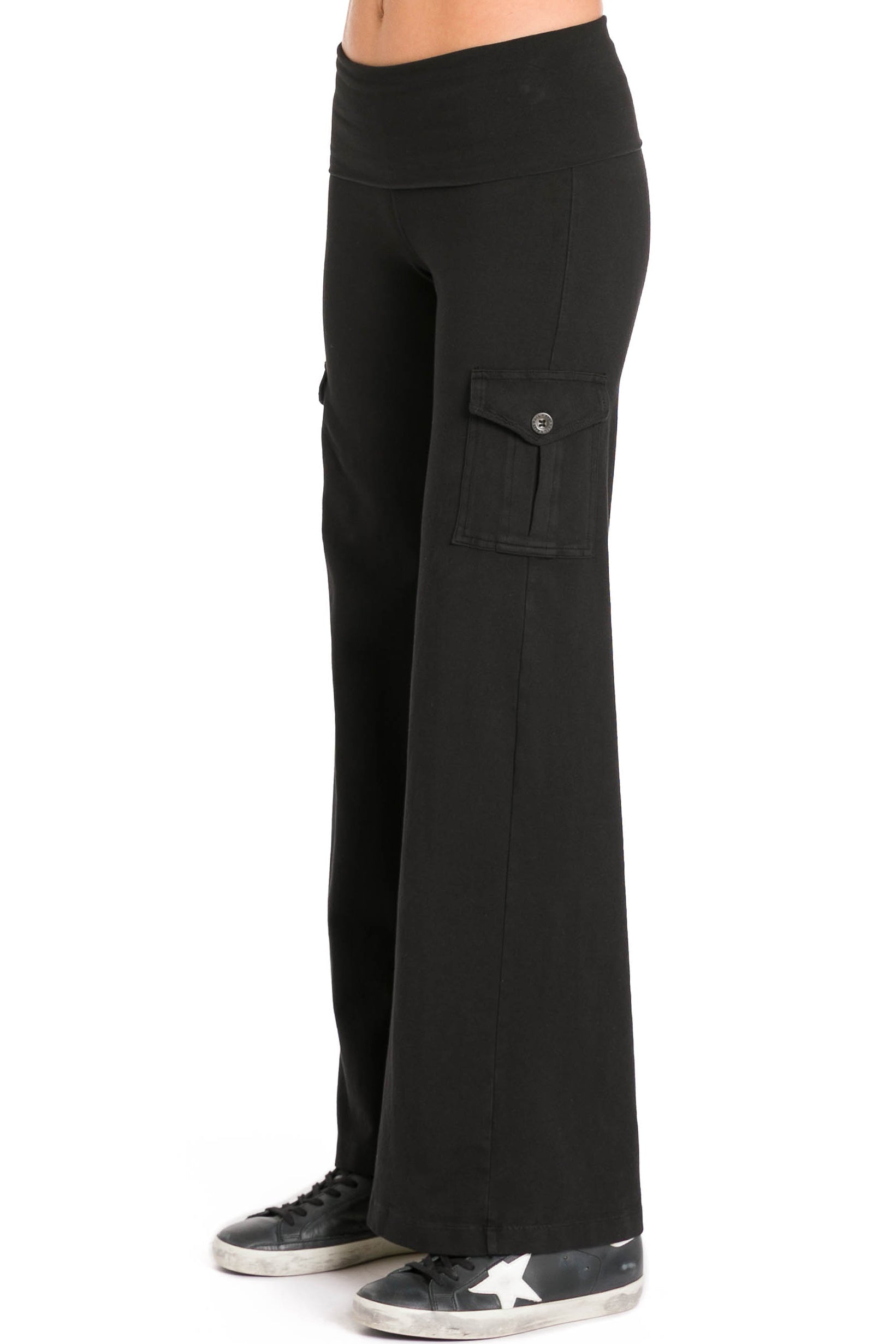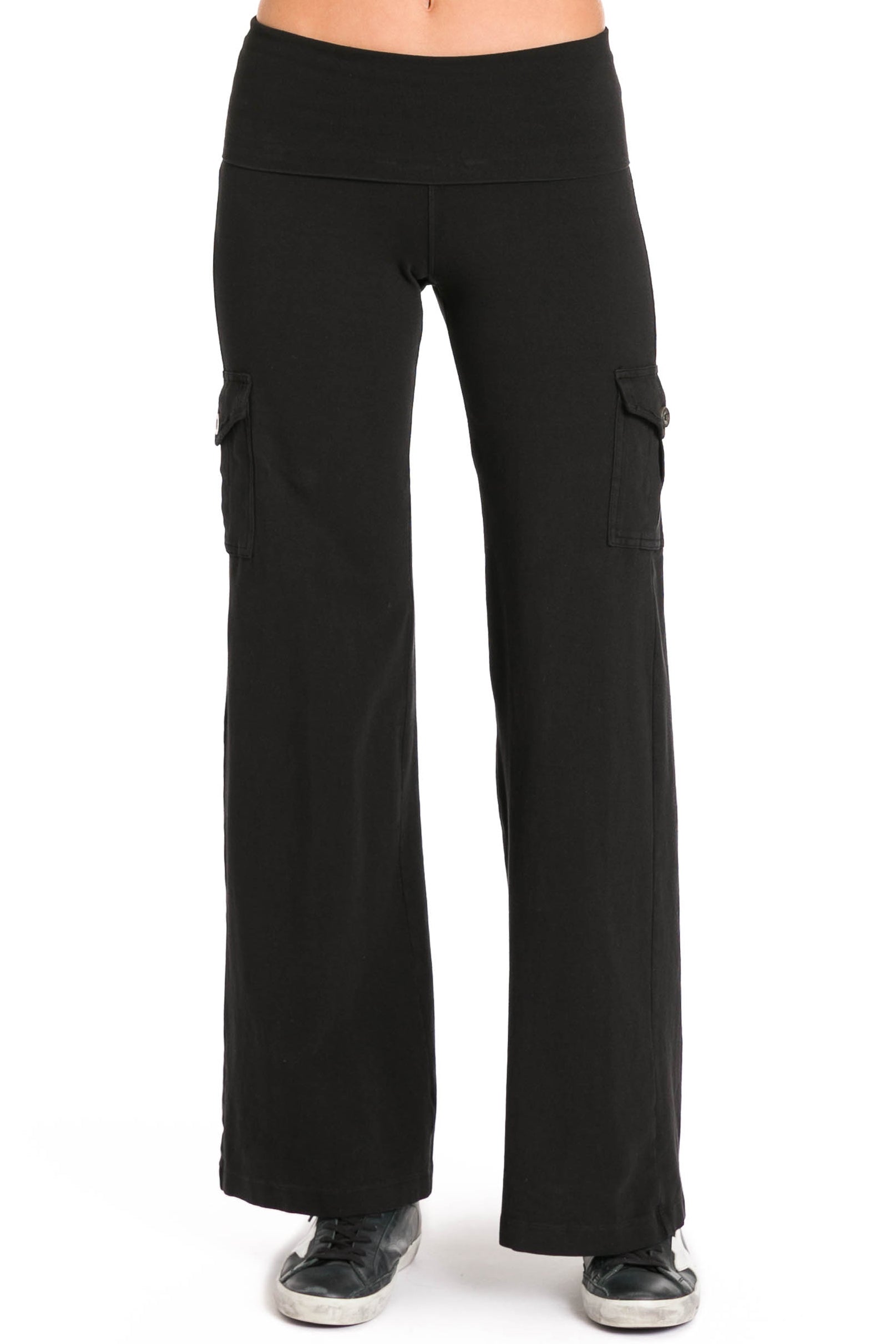 These are not your typical yoga pants. Our rolldown wide leg pant is flattering on all body types and is height-adjustable for a very low rise or all-the-way-up fit. Whether you are hitting the gym, running errands, or lounging all day, these cotton wide flare pants will be your go to piece.